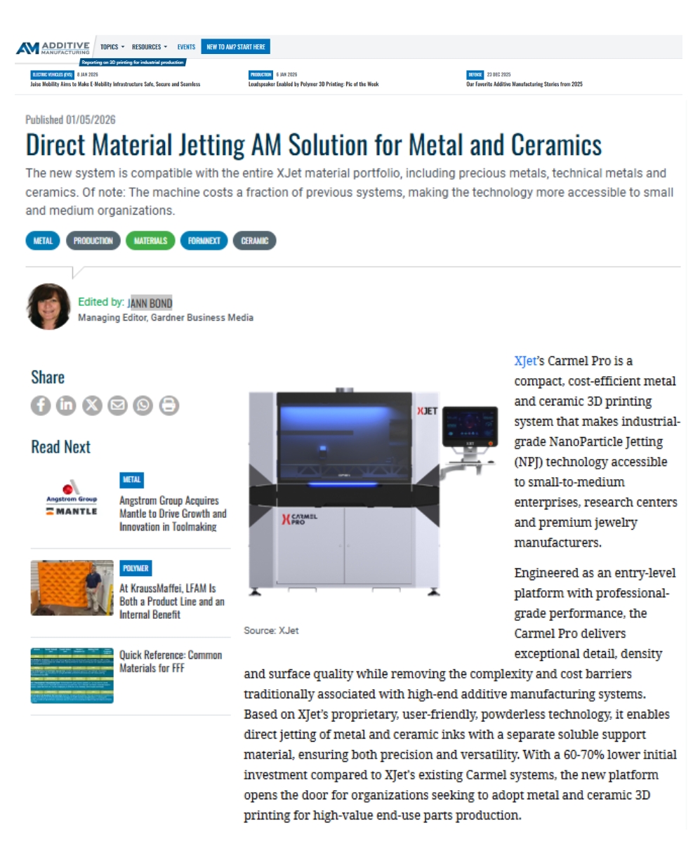 In the News 2026yael2026-01-14T15:38:08+00:00 In the News 2026 All 2026 news updates Find news updates by year 2026 2025 2024 2023 2022 2021 2020 2026 2025 2024 2023 2022 2021 2020 Direct Material Jetting AM Solution for Metal and Ceramics January 12, 2026