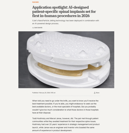 APPLICATION SPOTLIGHT: AI-DESIGNED PATIENT-SPECIFIC SPINAL IMPLANTS SET FOR FIRST IN-HUMAN PROCEDURES IN 2026February 20, 2026 THE FULL ARTICLE XJet's NanoParticle Jetting technology has been deployed in combination with an AI-powered design process.When told you need to go under the knife, you want to know you'll receive the best treatment possible. If you're able, you might endeavour to seek out the best available doctors, or the most specialist of hospitals. But you probably wouldn't give too much consideration to...